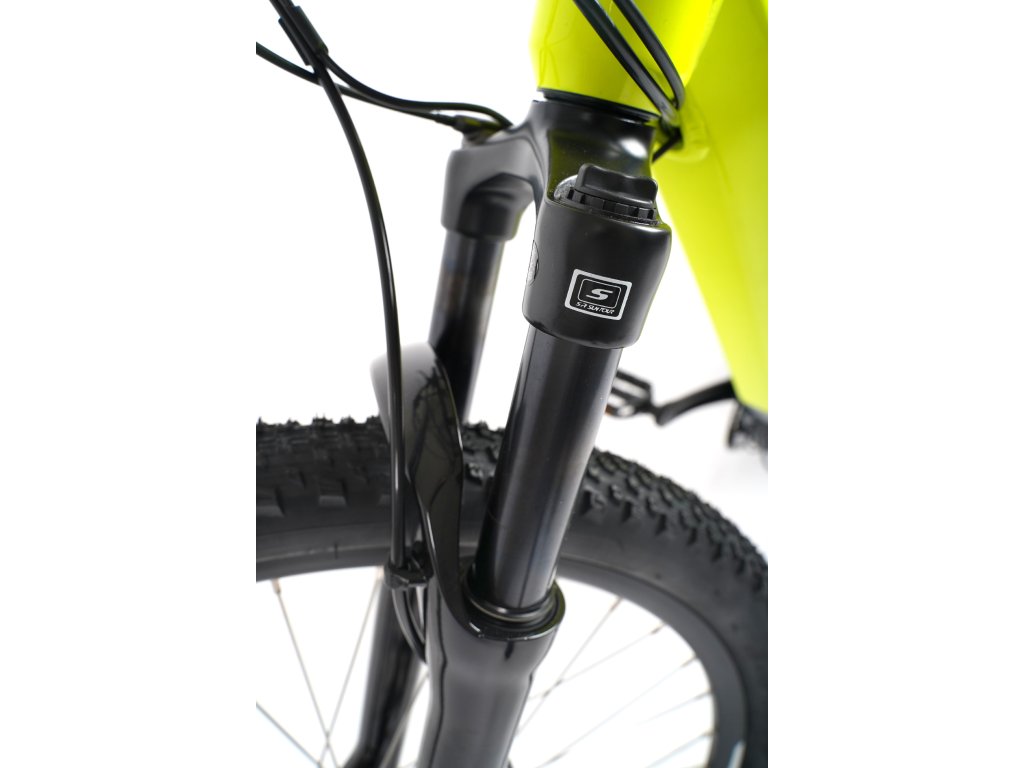 Rower został wyposażony w amortyzowany widelec SUNTOUR X1 Coil z regulacją, który bardzo dobrze radzi sobie na nieutwardzonych drogach i świetnie tłumi drgania, zwiększając poczucie komfortu podczas jazdy po nierównościach. Średnica goleni wynosi 32 mm, dzięki czemu widelec jest znacznie sztywniejszy i zwinniej reaguje na polecenia kierownicy. Skok 100 mm pozwala na wydajną jazdę po kamienistych drogach i leśnych ścieżkach. Amortyzator posiada blokadę skoku obsługiwaną z manetki zamontowanej na kierownicy.