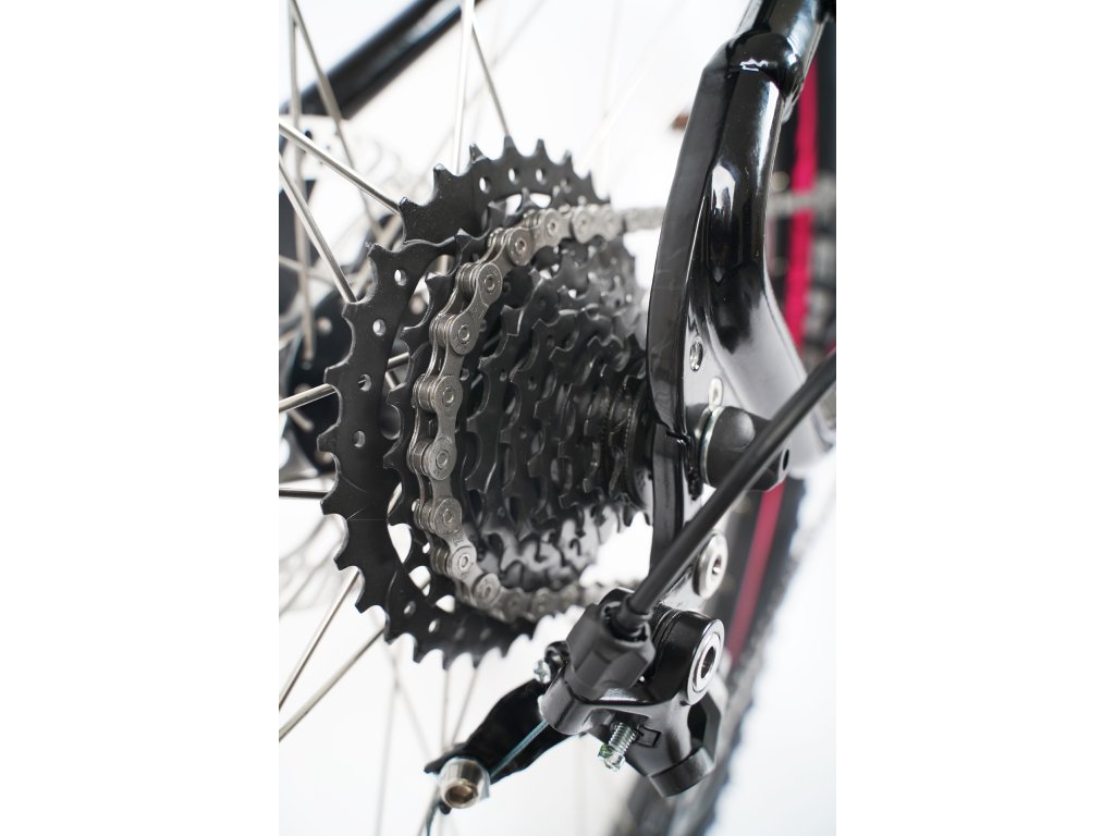 Rower elektryczny LOVELEC Sargo jest wyposażony w 9-biegową przerzutkę tylną Shimano Alivio, która pozwala na bezproblemową i szybką zmianę przełożeń w celu zwiększenia komfortu podczas jazdy. Prowadnica łańcucha (chain guide) zapobiega spadaniu łańcucha z przedniej zębatki, co jest bardzo pomocne podczas jazdy w wyboistym terenie.