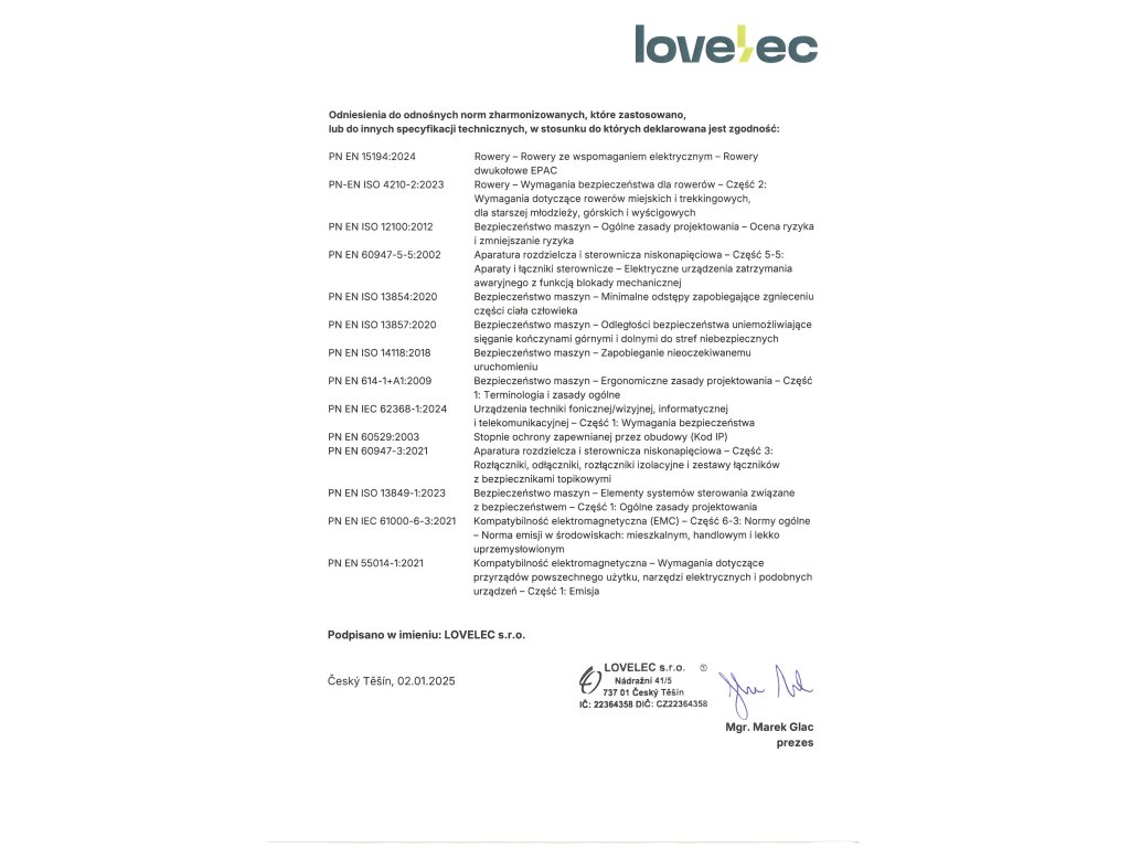 | ładowarka | EN, CE, 36 V, 2 A, czas ładowania 4–8 godzin (w zależności od pojemności akumulatora i stopnia jego rozładowania) |