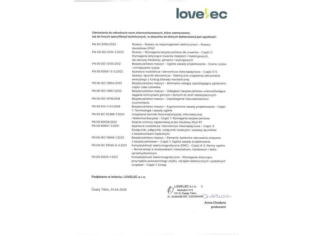 - Dwuletnia gwarancja na wszystkie części roweru łącznie z akumulatorem.
