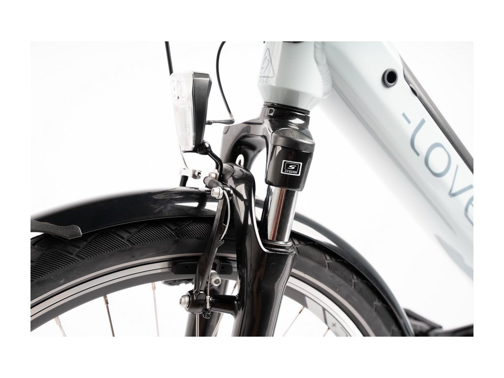 Kolejnym atutem roweru miejskiego LOVELEC Elys jest amortyzowany widelec Suntour CR85-E25 z możliwością regulacji, który skutecznie tłumi drgania i pozwala na odciążenie dłoni i przedramion, co skutecznie zwiększa poczucie komfortu podczas jazdy.