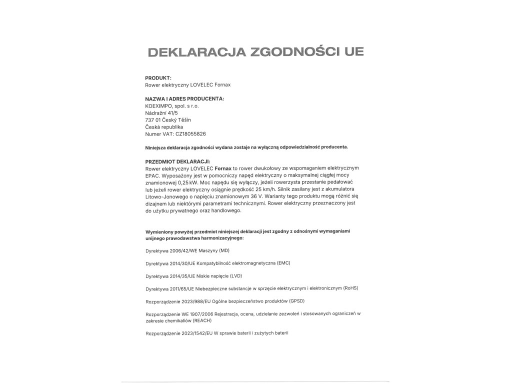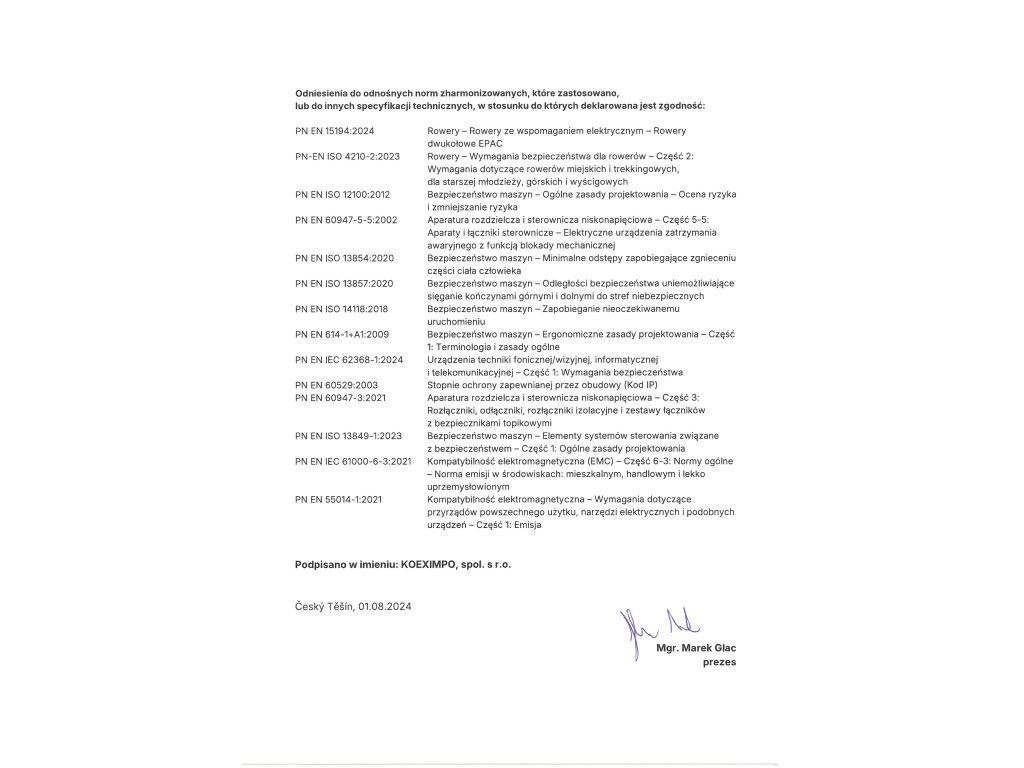 | ładowarka | EN, CE, 36 V, 2 A, czas ładowania 4-8 godzin (w zależności od pojemności akumulatora i stopnia jego rozładowania) |