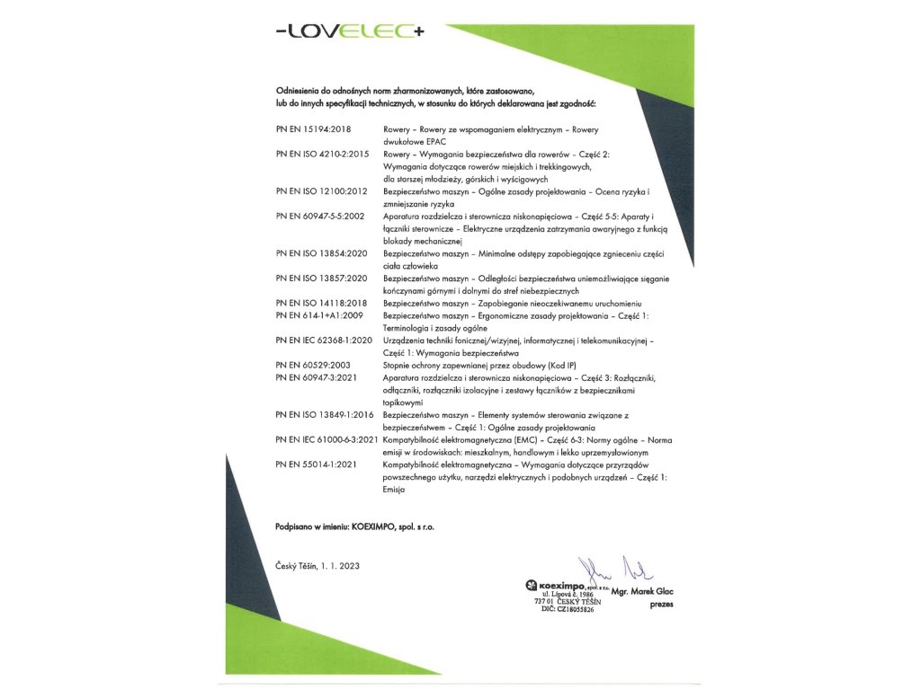 | ładowarka | EN, CE, 36 V, 2 A, czas ładowania 4–6 godzin |