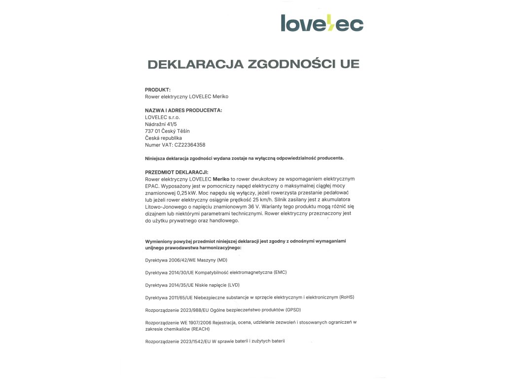 | ładowarka | EN, CE, 36 V, 2 A, czas ładowania 4–8 godzin (w zależności od pojemności akumulatora i stopnia jego rozładowania) |